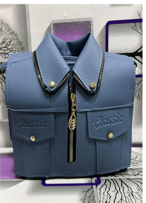A unique sling Blue Colour Handbag styled to look like a miniature jacket in Handmade for Girls//கைகளால் செய்யப்பட்ட, ஒரு சிறிய ஜாக்கெட் போன்று வடிவமைக்கப்பட்ட தனித்துவமான, நீல நிற சிலிங் பை, பெண்களுக்கானது.