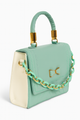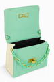 Strap/Chain: A chunky chain strap, made of both mint green plastic links and gold metal links, is attached to the sides of the bag.