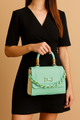 Handle: It has a single, rounded top handle in the same mint green color, with gold hardware connecting it to the bag.