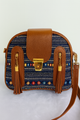 Material: The bag is made of a dark blue woven fabric with a geometric print, while the flap, piping, and long, adjustable strap are a solid brown, leather-like material.