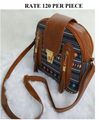 பொருள்: பையின் முக்கியப் பகுதி அடர் நீல நிற நெய்த துணியால் ஆனது. இதில் வடிவியல் அச்சு வடிவங்கள் உள்ளன. மூடி, ஓரங்கள் மற்றும் சரிசெய்யக்கூடிய நீளமான பட்டை ஆகியவை பழுப்பு நிற தோல் போன்ற பொருளால் ஆனவை.